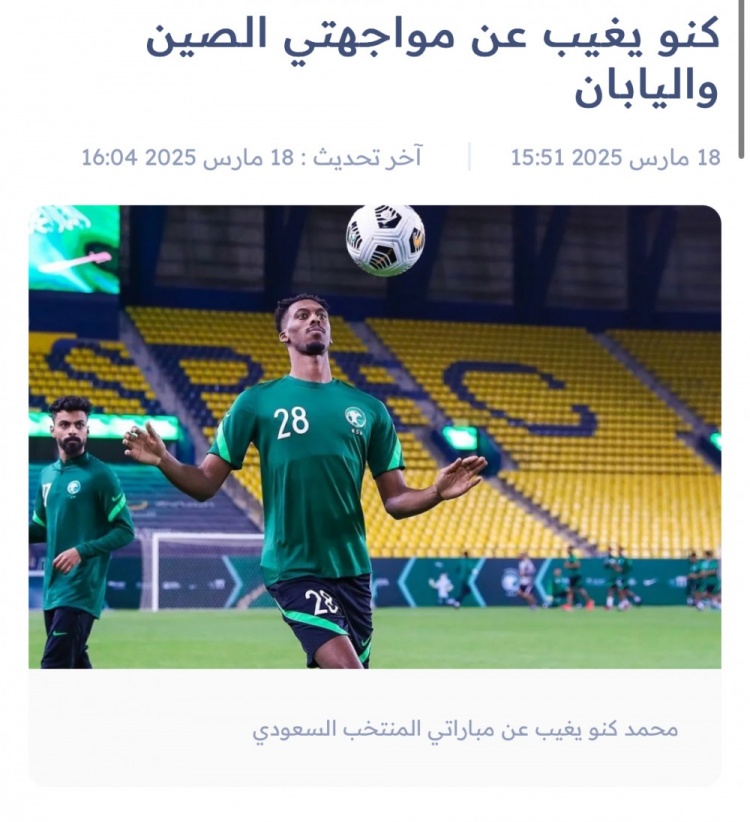 2025-03-19 11:57:38沙特媒体:沙特国脚中场穆罕默德-卡努因伤缺席对阵中国、日本