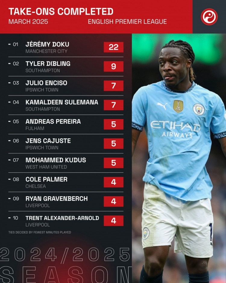 2025-04-01 11:53:10英超3月成功过人排名:多库22次断层居首,迪布林9次第二