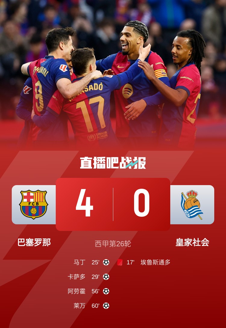西甲第26轮,巴萨4-0横扫十人皇家社会,阿劳霍传射,莱万进球。